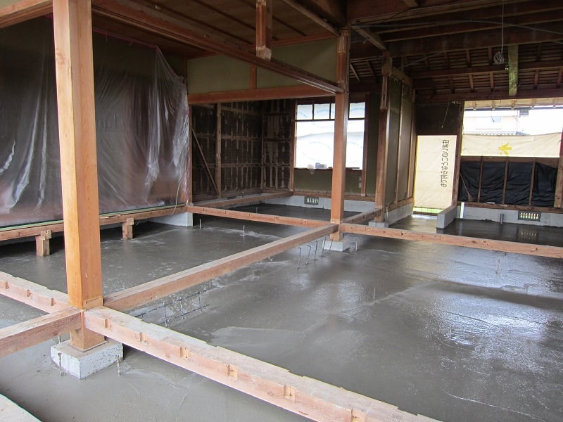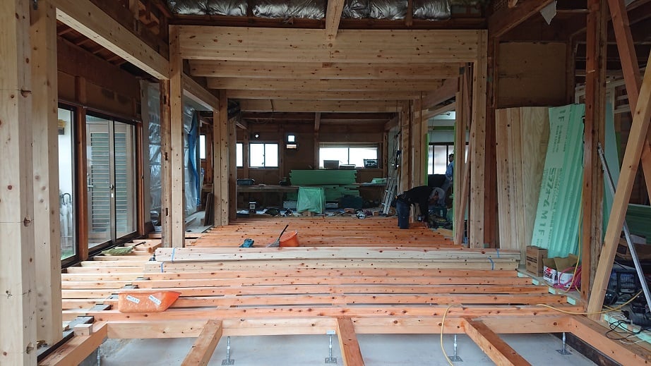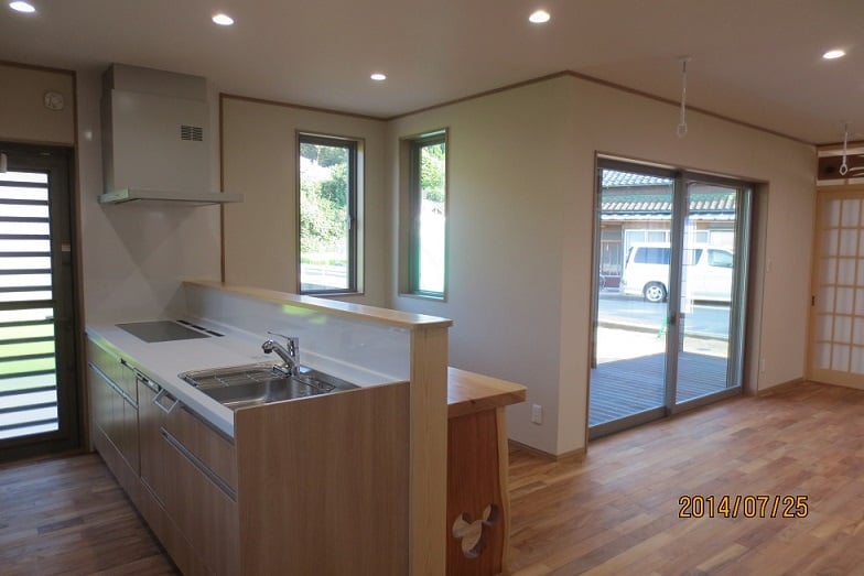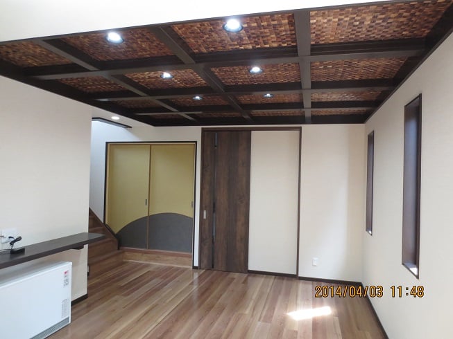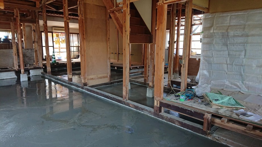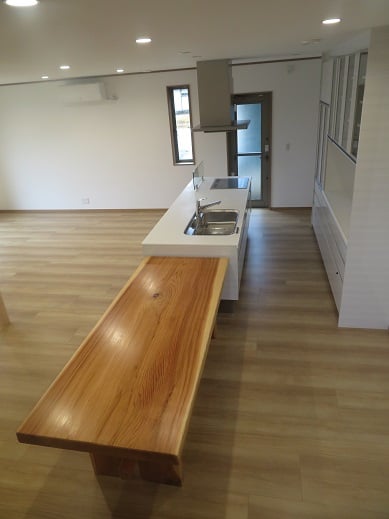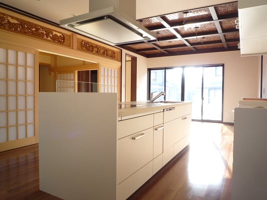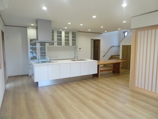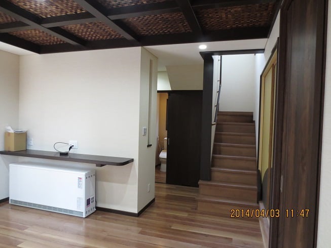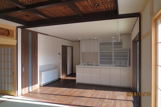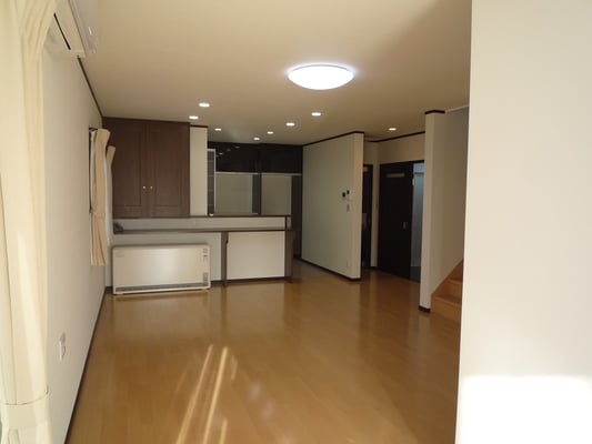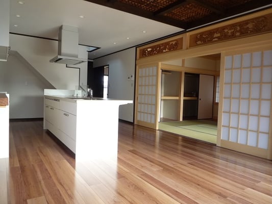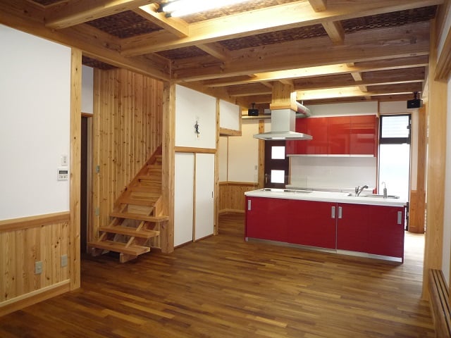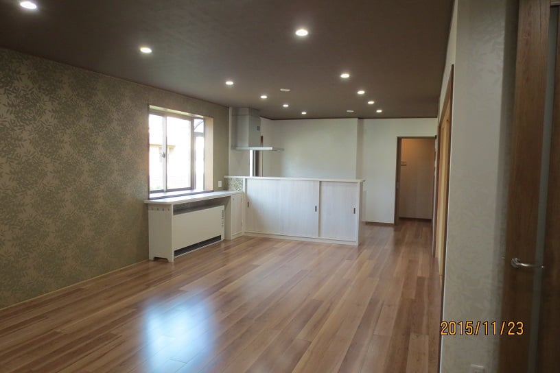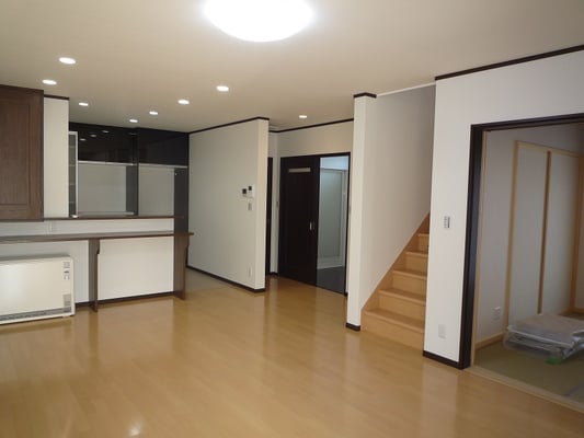 広いLDKを中心に階段・トイレ・和室・洋室のリフォームを施工させて頂きました。土間から湿気が上がらない事と、耐震用に鉄筋コンクリートの土間仕上げにさせて頂きました。天井は低い既存の梁材を撤去して新しい梁材入れました。天井も高くなり気持ちの良いLDKに仕上がりました。